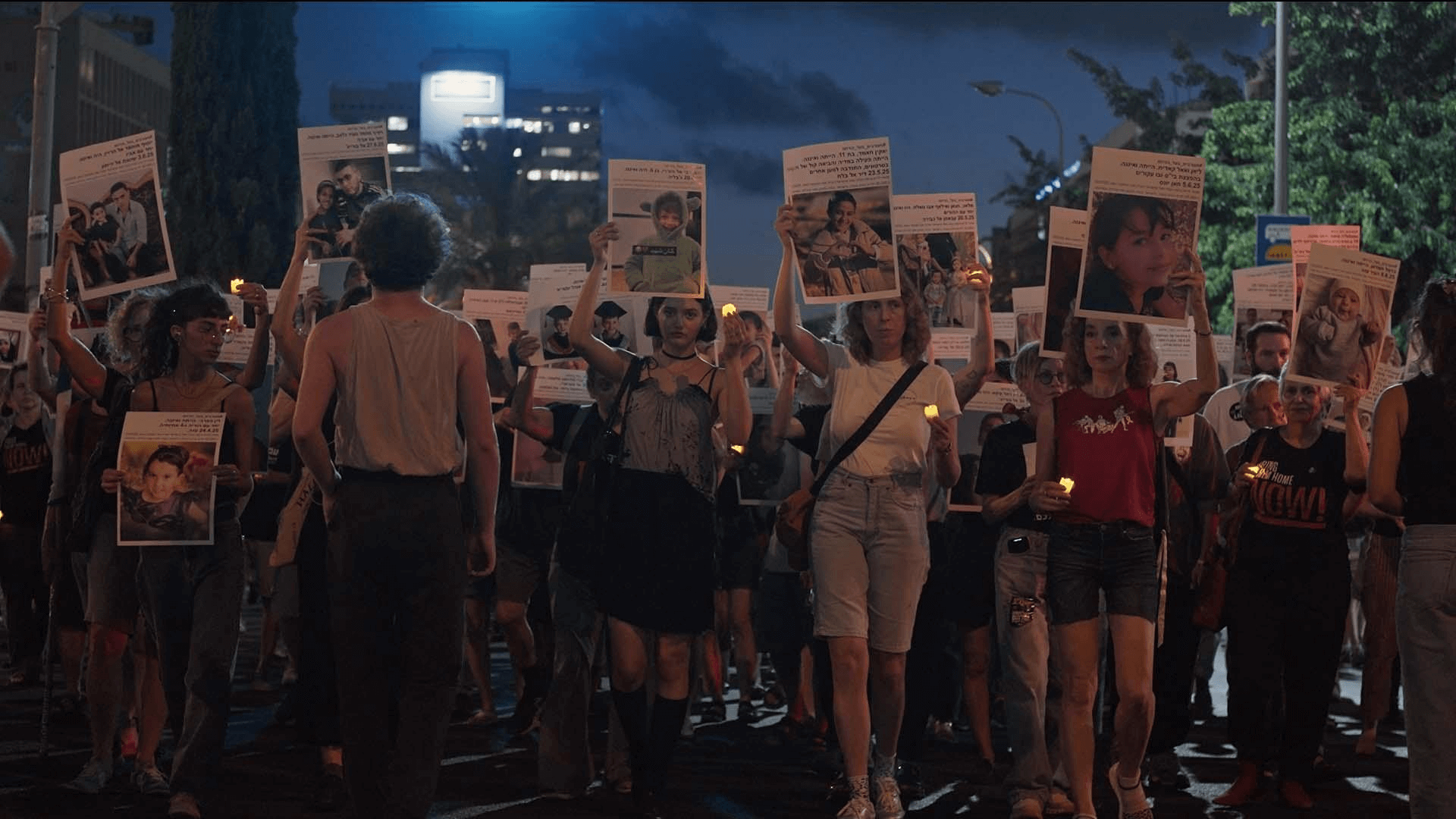 Um grupo de pessoas protesta, dentro de Tel Aviv, capital de Israel, contra a morte de crianças na guerra com a Palestina.