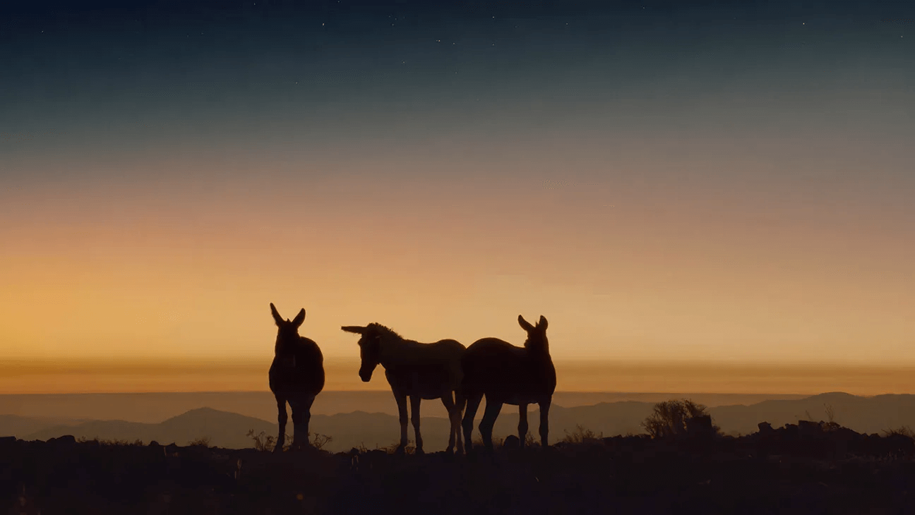 Três burros caminham morro acima pelo deserto, em direção a um observatório espacial no Chile.